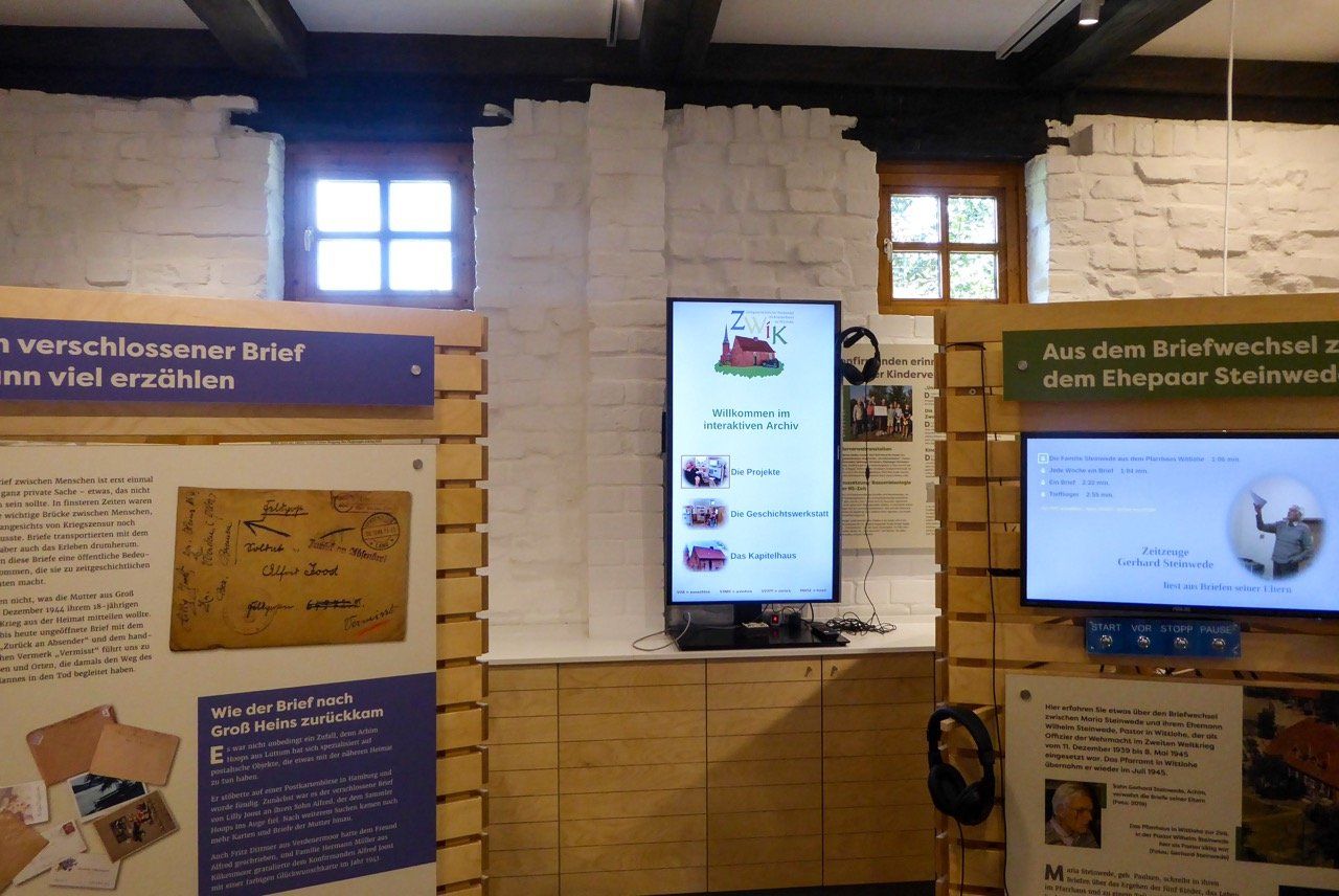 Die Zeitgeschichtliche Werkstatt hat mit den dreiseitigen Stelen im kleinen Kapitelhaus eine vergleichsweise große Präsentationsfläche geschaffen. Um weiteren, neuen Projekten Raum zu geben, werden sämtliche bisherigen Exponate mit ihren Texten, Fotos, Videos und Tondokumenten in einem digitalen Archiv gespeichert. Alles steht nun auf Knopfdruck zur Verfügung und kann auf dem neuen Hochkantbildschirm betrachtet werden.