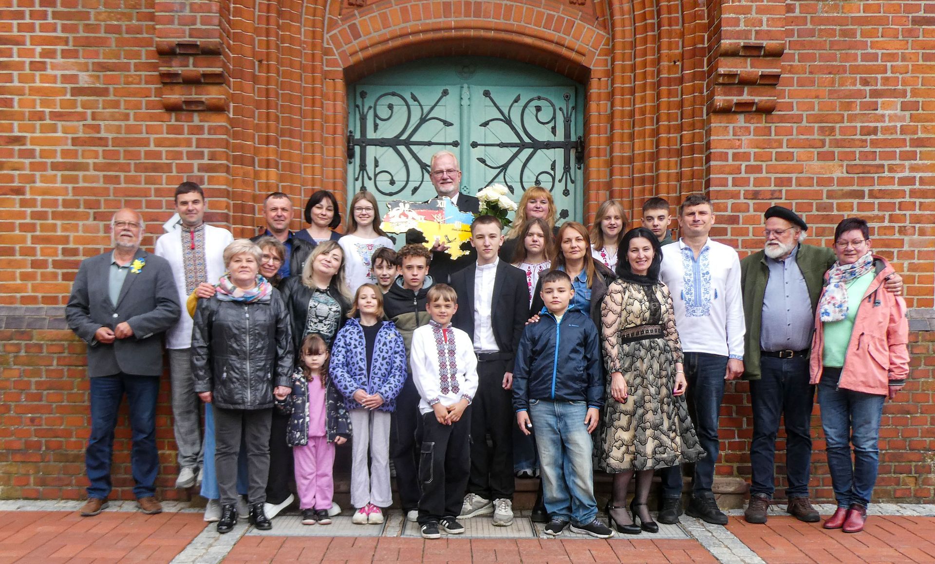 Pastor Wilhelm Timme freut sich über die deutsch-ukrainische Uhr, die ihm seine ukrainischen Schützlinge zum Abschied von der Jakobigemeinde geschenkt haben. Timmes Mitstreiter von der Ukrainehilfe, Hermann Meyer, (l.), Ehefrau Renate Meyer und Wilhelm Haase-Bruns (r,) waren auch zum Gemeindefest im Pfarrgarten gekommen. Zuvor hatte ZWiK-Vorsitzender Wolfgang Rodewald beim Abschiedsgottesdienst die besten Wünsche für den Ruhestand überbracht. Wilhelm Timme wird auch im Ruhestand der Zeitgeschichtlichen Werkstatt im Kapitelhaus zu Wittlohe (ZWiK) erhalten bleiben.
